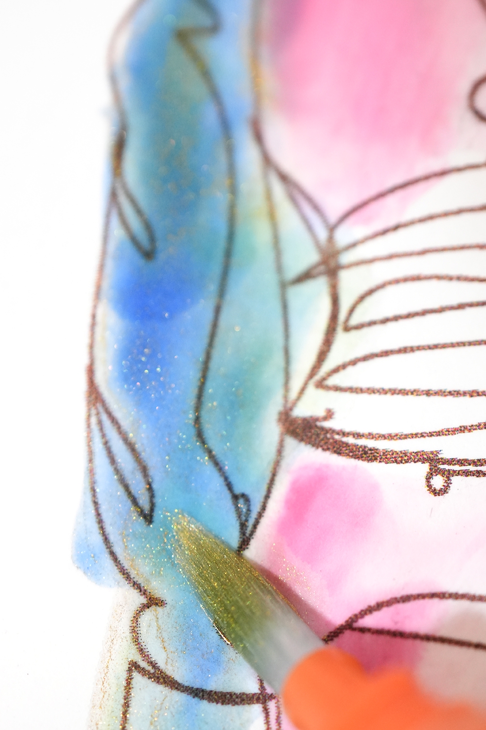水で「ブラッシュ」の穂先を洗ったら、すぐに別のインクを使うことができる見た目は水筆ペンとも似ていますが、ペン軸はただの持ち手で水を入れるわけではないので、まさに絵筆や書道筆のような使い心地です。万年筆人気は高くさまざまな色のインクが販売されているので、インク沼にハマっている方もいるかもしれません。そんな方々が、集めたインクを万年筆だけでなく筆書きするのに活用できるのもよいところではないでしょうか。「万年筆ペン先のつけペン hocoro ブラッシュ」で絵を塗る毛筆タイプの「万年筆ペン先のつけペン hocoro ブラッシュ」は、文字を書くだけでなく絵を描くのにも活用できます。ここからは、色塗りに使っていきます。毛筆タイプなので万年筆と違い広い面を塗るのにも向いています。万年筆インク用の薄め液を持っていなくても、腐らせてしまう心配がなく水や精製水でインクを薄めることができるのもつけペン式のメリットです。水彩画のようにグラデーションにしたりにじませたりする表現も可能です。また、万年筆タイプのペン先やカートリッジ式のもののように詰まる心配がないので、ラメインクにも適しています。