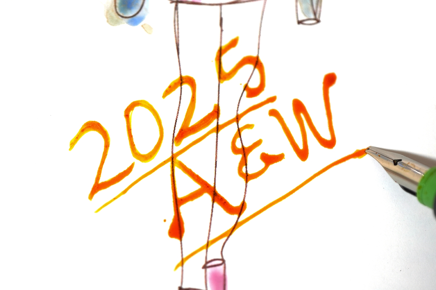 「ブラッシュ」で色を塗った上に、「万年筆ペン先のつけペン hocoro 中字」でチェック柄を描いたほかにも「1.0mm幅(カリグラフィタイプ)」と「2.0mm幅(カリグラフィタイプ)」のペン先があります。筆者がカリグラフィが書けていないので(すみません…)書き味が伝わりにくいかもしれませんが、ペンを自分の側に倒すほど太い線になっていきます。ここでは、「2.0mm幅」を使い「2025 A&W」の文字を書いてみました。