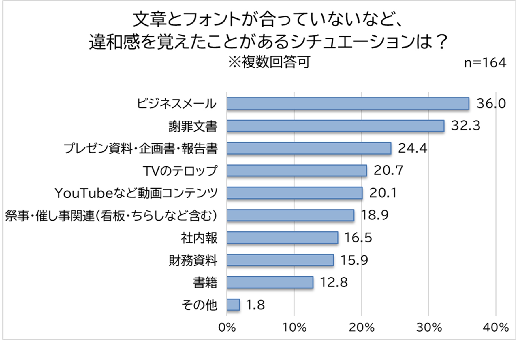 ビジネスシーン以外でも「明朝体」が選ばれる傾向は高めですが、ビジネス文書の場合と比べると差がハッキリと現れてきます。SNSや動画コンテンツ・TVのテロップなど、ビジネス以外のシチュエーションでは、「明朝体」以外のフォントの伸び具合が顕著です。たとえば「看板・チラシ・推し活のうちわなど祭事・催し事関連」という項目では、比較的にポップなフォントを適切だと感じる人が多く、「デザイン書体」が33.0%、「装飾書体」が29.0%で、「手書き書体」が29.0%でした。とはいえ、どのシチュエーションにおいても「明朝体」や「ゴシック体」には一定の高い割合の票が集まっています。この2つのフォントは、幅広い用途で違和感なく使える印象を持たれているようです。約3人に1人が「フォントに違和感」を覚えた経験がある次に「フォントに対して違和感を覚えたことがあるか」という内容を見ていきます。約3人に1人(164人)は多少なりとも違和感を覚えた経験があったそうです。そのシーンとして最も多かったのは36.0%の「ビジネスメール」で、2位は32.3%の「謝罪文書」、3位は24.4%の「プレゼン資料・企画書・報告書」でした。