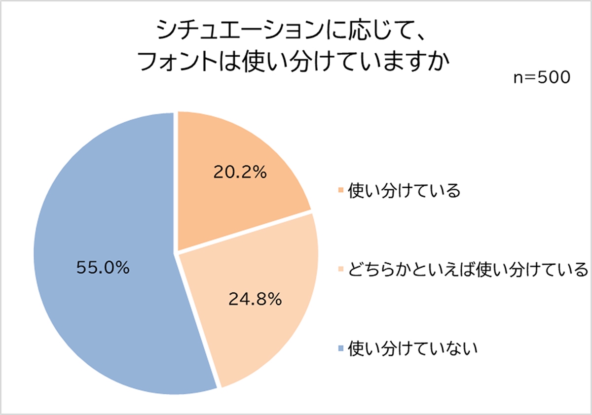 場面に応じたフォントの使い分けへの意識の違い今回のアンケートでは、利用するシーンによってフォントを意識的に使い分けているかどうかも調査されました。その結果、「使い分けている」と「どちらかといえば使い分けている」の合計は全体の45%にのぼり、多くの人が場面に応じたフォント選びを行っているようです。