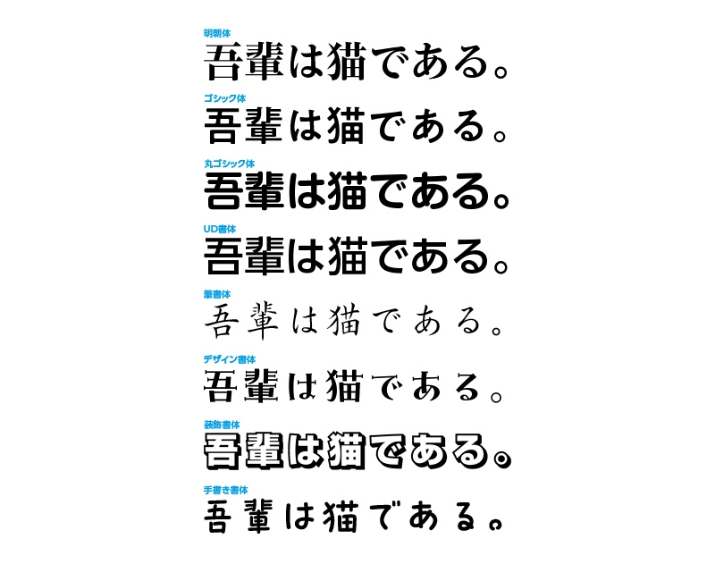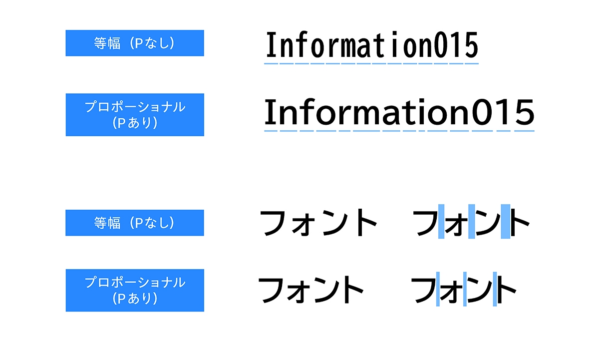 ちなみにこの「P」の有無は等幅フォントとプロポーショナルフォントの違いを示し、「P」は「プロポーショナル(proportional)」の「P」です。「P」が名前に加えられているプロポーショナルフォントでは英数やかなの幅が文字の形によって異なり、付いていない等幅フォントでは、全角・半角という一定の幅で文字が表示されます。