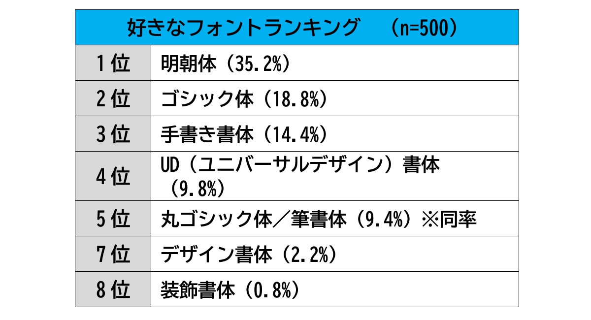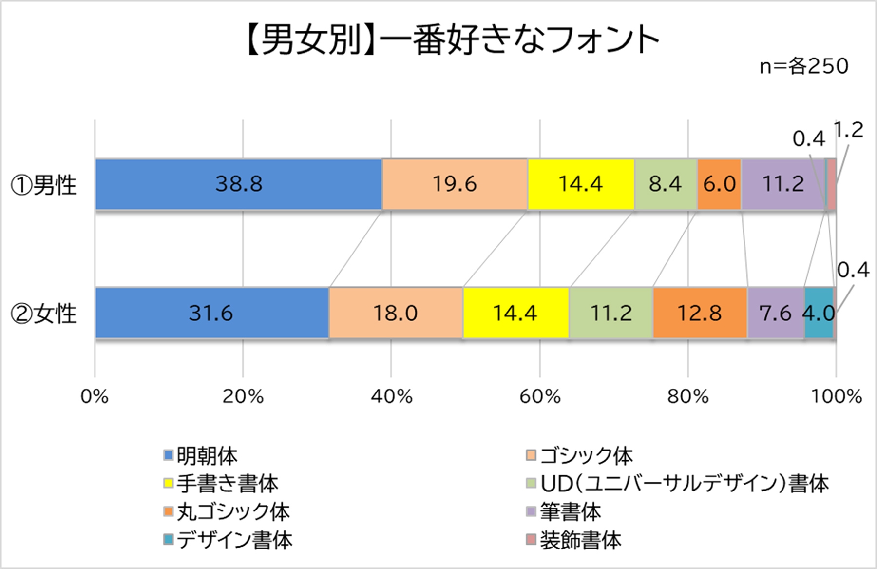 男女別では、上位3位までは全体のランキングと同じでしたが、4位に男性で「筆書体」(11.2%)、女性で「丸ゴシック体」(12.8%)が選ばれています。「丸ゴシック体」と回答した女性は、なんと男性の2倍以上です。