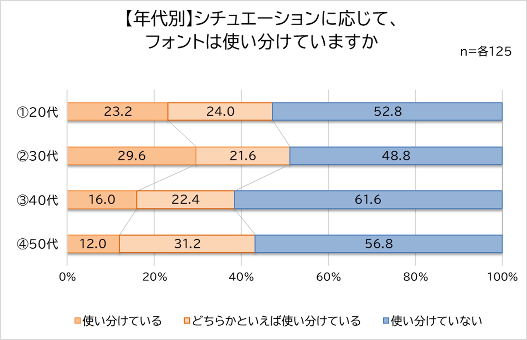 フォントを使い分けるシーンの代表例・自分との距離感や役職の上下関係にて、フォントを敬語のように使い分けている(東京都・40歳男性)・読み手の年代によって分けている。老眼だと丸ゴシックや明朝が見やすい印象。若年だと特に気にする必要がない(東京都・48歳女性)・外部用や堅めの資料は明朝体、内部用や柔らかめの資料はゴシック体(静岡県・52歳男性)・社員旅行など楽しめな企画のときはポップな字体を選択している(神奈川県・33歳男性)・社外向け文書等はきちんとビジネスの雰囲気のあるものを使用するが、社内向け文書など、カジュアルなものはポップなフォントを使用することもある(兵庫県・39歳女性)・個人的に使うテキストメモは、テンションの上がるかわいいフォントを使うようにしている(千葉県・32歳女性)・資料などは見やすくゴシック体、チラシなどは楽しい雰囲気のポップ体を、体外的なお知らせなどは明朝体(大阪府・48歳女性)・高級感を出したいチラシ作成では教科書体、メールでは誰にでも好かれるベーシックな字体など使い分けている(東京都・50歳女性)・謝罪文の作成の際は明朝体を、イベント資料の作成時はポップで大きなフォントを使用している(和歌山県・27歳女性)・デザインの仕事をしているので、内容に合ったものに適宜変えている。読みやすさ重視ならUDフォント、見出しはゴシック、本文は明朝で抑揚をつけるなど(大阪府・29歳女性)調査を年代別に見ると、20〜30代で比較的にフォントを使い分けている人が多い傾向でした。「使い分けている」と「どちらかといえば使い分けている」の合計の数値は30代が最多です。