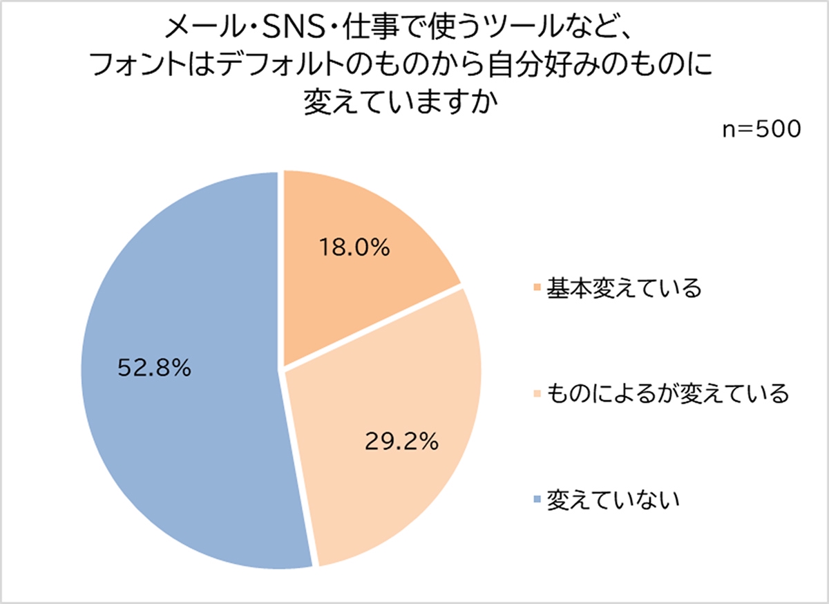 続いては、普段使うメール/SNS/仕事用ソフトなどのツールで、デフォルトのフォントから自分好みのフォントに変更しているかという質問です。「基本変えている」が18.0%、「ものによるが変えている」が29.2%で、合計すると何らかのかたちでフォントをカスタマイズしている人は47.2%となります。これはフォントにこだわりを持っている人の割合と近く、単なる意識だけでなく実際の行動にもつながっている傾向が見えてきました。
