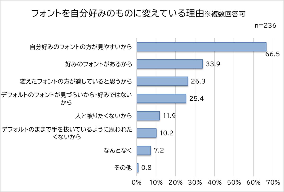 その理由を複数回答可で聞いたところ、「自分好みのフォントの方が見やすいから」という回答が66.5%で最も多く、33.9%の「好みのフォントがあるから」や、26.3%の「変えたフォントの方が適していると思うから」などが続きます。好みも大きく影響していますが、同時にフォントへのこだわりは感性だけでなく「見やすさ」という実用性とも結びついていることが分かる結果と言えるでしょう。各自のフォント選びに対する意識の高さがうかがえます。