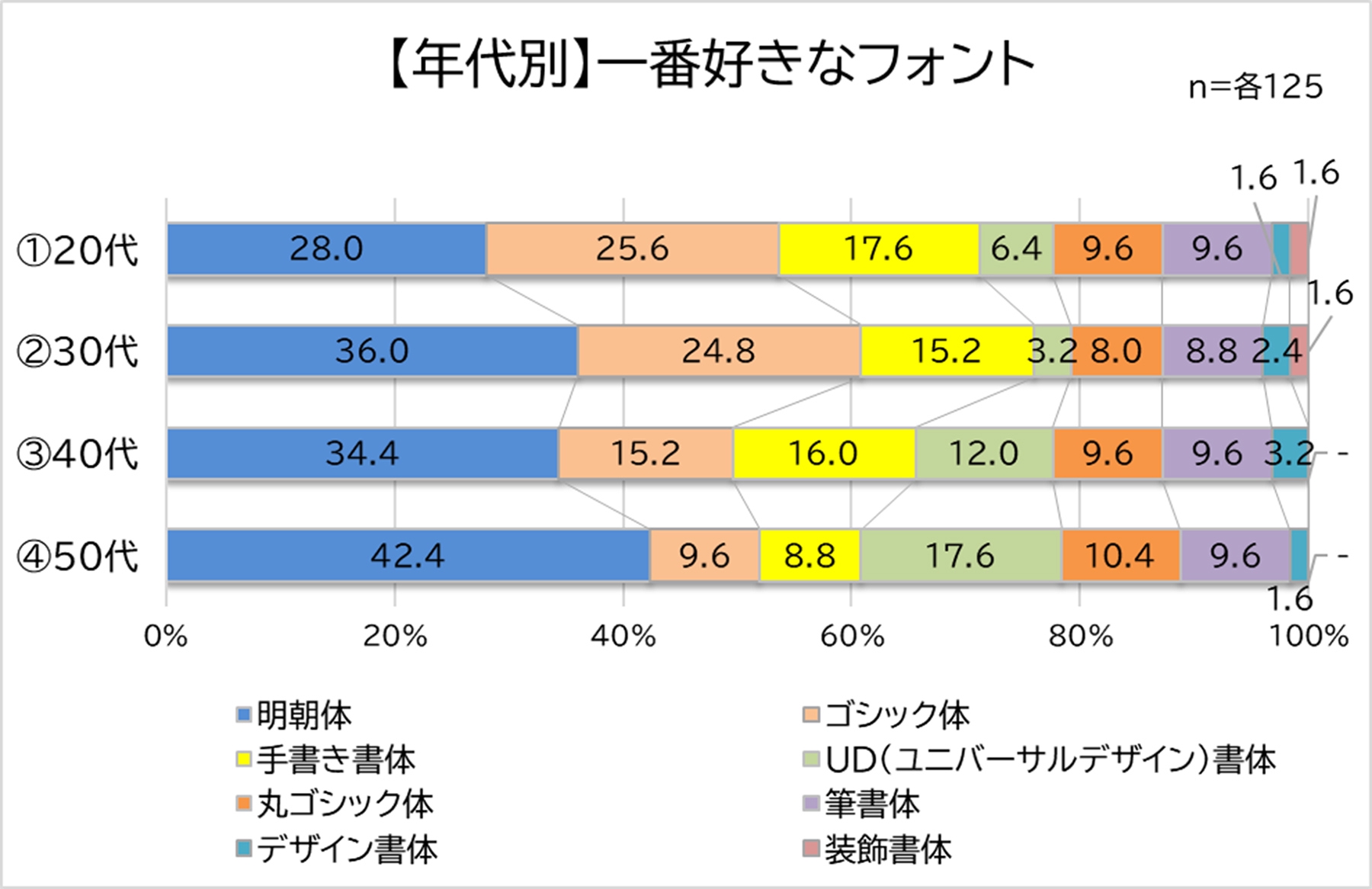また、年代別で見ると1位は共通して「明朝体」でしたが、2位は20代と30代で「ゴシック体」(20代=25.6%/30代=24.8%)、40代で「手書き書体」(16.0%)、50代で「UD書体」(17.6%)と好みが分かれました。特にゴシック体が若い層に好まれやすい傾向と、UD書体が年配に好まれやすい傾向は目立つ結果です。