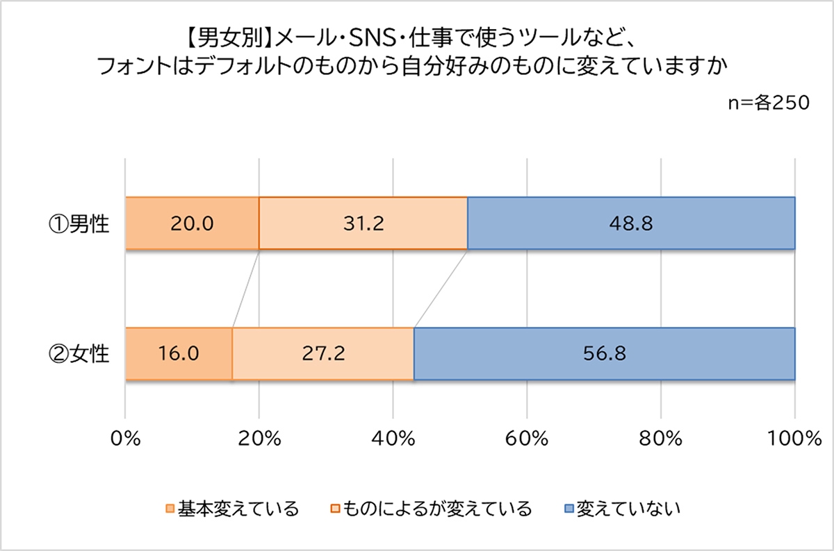 ちなみに、調査対象者を男女別に見ると、わずかな差ではありますが男性のほうがフォントのカスタマイズに積極的な傾向です。