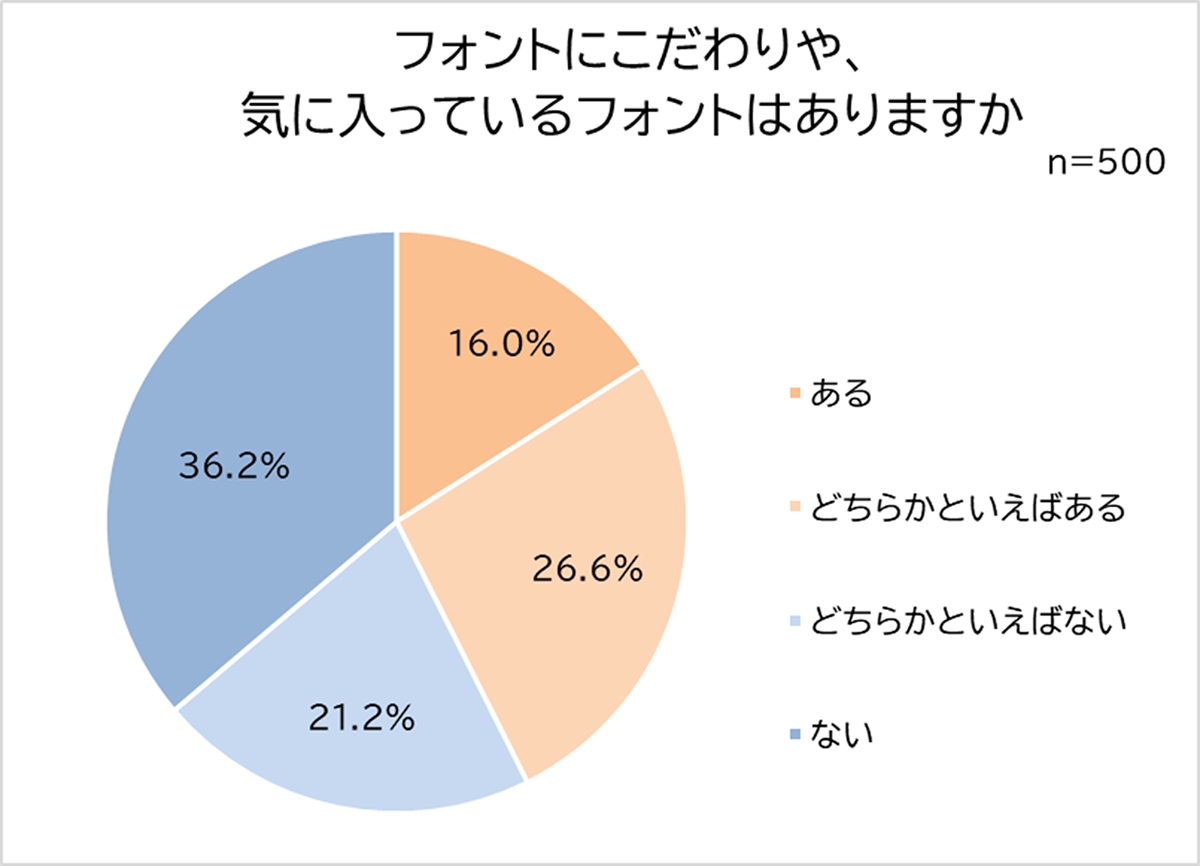 株式会社モリサワが「フォントにまつわる意識調査」を実施し、その結果を公開しました。フォントに日常的に触れる機会が多いと考えられる20〜50代の社会人の男女500名を対象としたアンケートです。調査結果からは、フォントの使い分けなどに対する生活者の意識が明らかになりました。この記事では、特徴的なポイントを紹介していきます。【目次】4割以上の人たちが持つ「フォント」へのこだわりアンケートでは、まず最初にフォントへのこだわりはあるかどうかが探られました。「フォントにこだわりや、気に入っているフォントがある」と答えた人は全体の16.0%、「どちらかといえばある」と答えた人は26.6%です。合わせて42.6%にものぼり、必ずしもデザイナーのような専門家でなくても、半数にかなり近い割合の人たちがフォントに何らかのこだわりを持っていることが明らかになっています。