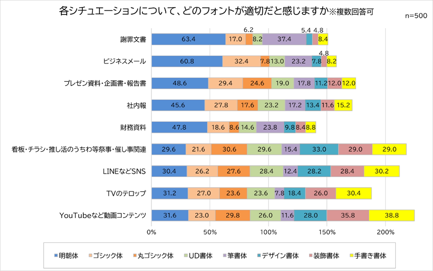シチュエーションごとに具体的に選ばれるフォントの傾向前段で、フォントをシーン別に使い分ける人の割合が全体の45%にのぼることを紹介しましたが、ここからはより具体的に、どのようにフォントが使い分けられているを見ていきます。アンケートでは、明朝体/ゴシック体/丸ゴシック体/UD書体/筆書体/デザイン書体/装飾書体/手書き書体が提示され、さまざまなシチュエーションでどのフォントが適切だと感じるかが質問されました(複数回答可)。