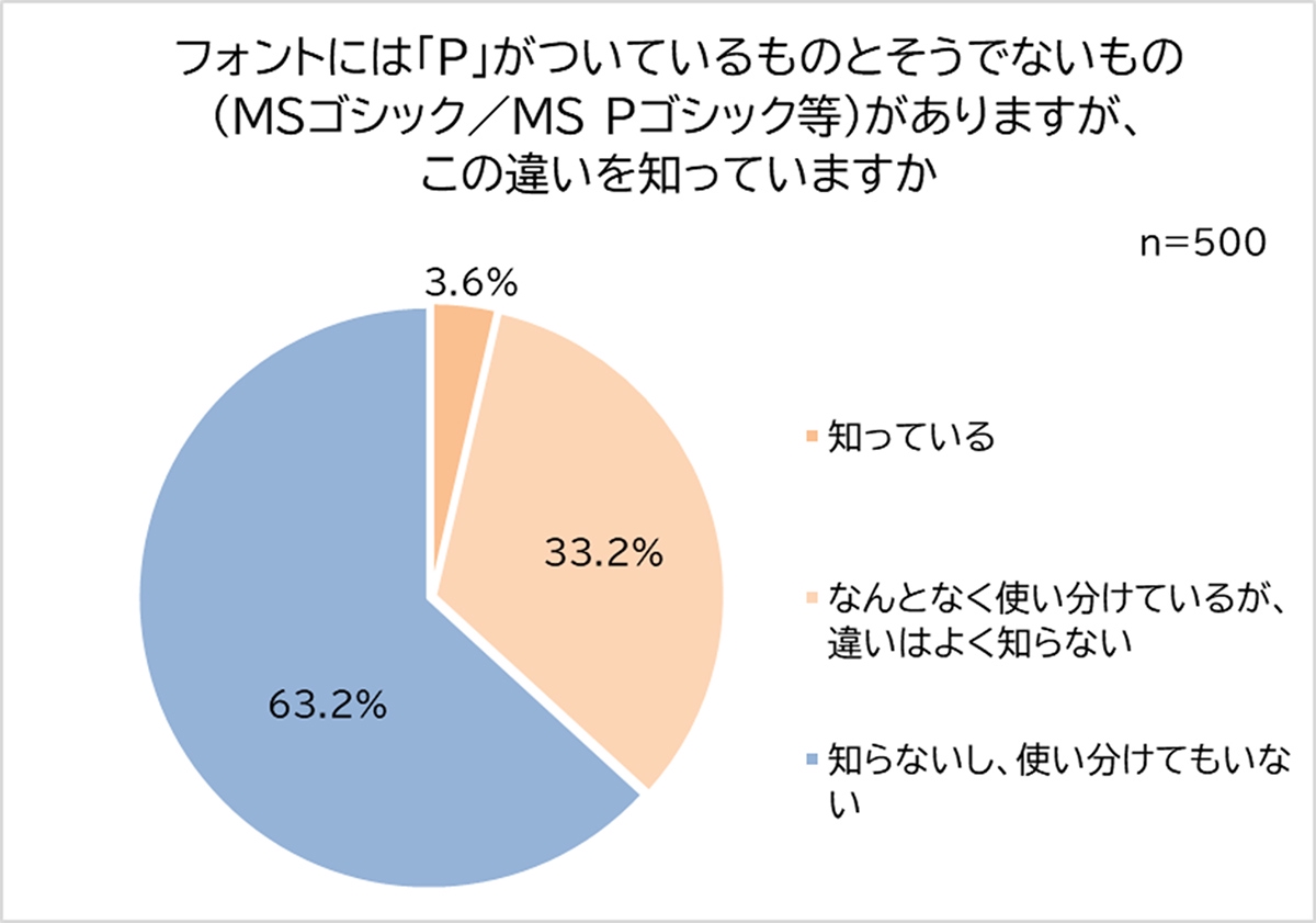 一般的にデザインの分野では、「女性向けの媒体では柔らかい丸ゴシック体」「若者向けの媒体ではゴシック体」など、ある一定のセオリーが存在しています。今回の「好きなフォントランキング」の調査結果は、それらのセオリーがデータに裏付けられたものであることを示す内容です。日々フォント選びに悩むデザイナーにとっては、かなり有益な調査と言えるのではないでしょうか。正答率わずかに3.6%の「フォント名のPの意味」最後に「フォントに関する知識調査」を紹介します。この調査では、単に使い分けや好みだけでなく、フォントに対する関心が知識としても意識されているのかを探る内容が用意されました。まず、「MSゴシック/MS Pゴシック」などでのフォント名の「P」の意味についての認知度を探る調査では、はっきりと「知っている」と答えた人はわずかに3.6%です。