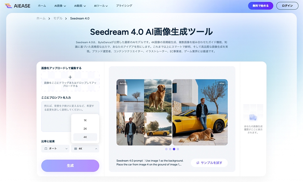「AI Ease」のSeedream 4.0 AI画像生成ツールURL:https://www.aiease.ai/ja/model/seedream-4-0/「AI Ease」上でも「Seedream 4.0」の強みはそのまま生かされており、4Kサイズの画像の生成が可能です。参考画像のアップロードは他モデルを上回る最大10枚まで対応し、プロンプトには最大2,000文字までのテキストを入力できます。ただし、「Seedream 4.0」は前述の通りに「長い説明や複雑な指示はもう不要」と紹介されるほどユーザーの意図を読み取る能力に長けているため、従来ほどの厳密なプロンプトを記述しなくても十分な結果を得ることができます。さらに本サービスには「Nano Banana」や「Flux Kontext」といった「Seedream 4.0」以外の生成AIモデルも搭載されているため、目的に応じてモデルを切り替えながら利用することもできます。「AI Ease」での説明文によると「創造性と精密なコントロールの両方を求める」場合にオススメなモデルが「Seedream 4.0」です。* * * * * * * * * *「Seedream 4.0」は最大4Kサイズの画像の出力に対応するため、生成されたビジュアルをそのまま最終データに採用する使い方もできます。テキストやブランド、知識要素を含むプロンプトについて「多くのモデルより正確に対応できる」と紹介されていることも見逃せません。これまでの生成AIで一般的であった「単に文字を画像に変える」という使い方からさらに進化し、複数の画像も参照させながら柔軟かつ高度な使い方ができるAIモデルです。sponsored by AIEase