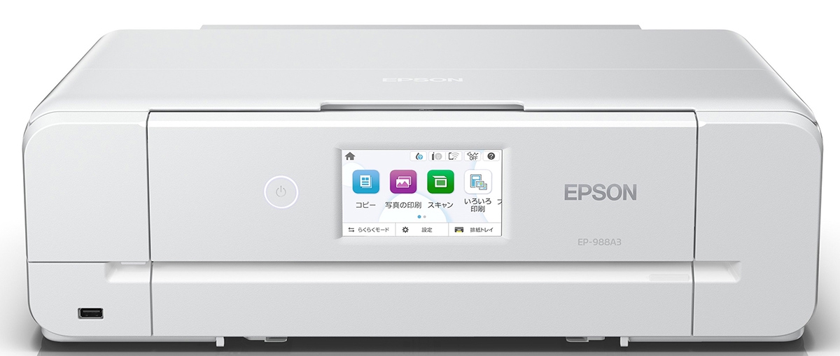 エプソン販売株式会社は、2025年11月20日(木)に「EP-988A3」を発売します。家庭用インクジェットプリンター「カラリオ」シリーズの新モデルで、オープン価格の製品です。6色インクを採用し、コンパクトなサイズながらA3サイズの出力に対応します。【目次】人肌や空の色も滑らかに出力できる6色インク本製品は、出力解像度が最高5,760×1,440dpiのインクジェットプリンターです。染料インクを採用し、シアン/マゼンタ/イエロー/ブラック/ライトシアン/ライトマゼンタの6色で構成されています。ライトインクは滑らかなグラデーション表現に役立ち、素肌や空なども豊かな階調でプリントしやすい製品です。本製品はA3サイズに対応するプリンターですが、筐体がコンパクトで設置場所を選びません。本体サイズは使用時が479(幅)×295(高さ)×668(奥行)mm、収納時が479(幅)×148(高さ)×356(奥行)mmに抑えられています。本体の重量は約8.5kgです。 設置イメージボディはコンパクトでありながら、本体には自動両面プリントユニットが標準装備されています。給紙は前面2段+背面の3way方式で、前面の2段給紙は上下に異なる用紙をセットすることが可能です。さらに、従来モデルから前面デザインの継ぎ目も改良されており、よりシンプルで洗練されたデザインになりました。出力スピードはL判写真で約13秒本製品には「高速MACHヘッド」が採用されており、一度に吐出されるインクの量も吐出回数も大幅にアップしています。L判写真用紙1枚のプリントは約13秒です。インターフェイスは有線LAN(10/100BASE-TX)とHi-Speed USB×2(前面:外部記憶機器接続用+背面:PC接続用)で、IEEE802.11b/g/n/a/acによるWi-Fi接続にも対応します。無線LAN設定はプリンターの操作パネルから行うことができ、シンプルなUIで操作に迷うこともありません。無線LAN対応をさらに便利にする機能として、印刷スタートに合わせての本体の自動電源オン、排紙トレイの自動オープン、設定した時間経過での自動電源オフなどの機能も利用が可能です。既存モデルで好評だった「らくらくモード」も採用本製品にはコピーやスキャンの機能も搭載されています。コピーとスキャンにまつわる多彩な機能も用意されており、特徴的なものの1つが「A3/B4原稿二つ折りコピー」機能です。大きなサイズの原稿を二つ折りにし、裏表2回に分けてスキャンすることで等倍でコピーできます。学習用の教材のコピーやテレワーク業務での資料の作成など、幅広い用途に活用できる機能です。