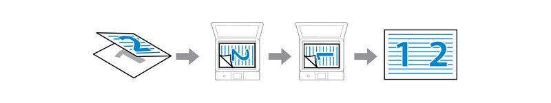 設置イメージボディはコンパクトでありながら、本体には自動両面プリントユニットが標準装備されています。給紙は前面2段+背面の3way方式で、前面の2段給紙は上下に異なる用紙をセットすることが可能です。さらに、従来モデルから前面デザインの継ぎ目も改良されており、よりシンプルで洗練されたデザインになりました。出力スピードはL判写真で約13秒本製品には「高速MACHヘッド」が採用されており、一度に吐出されるインクの量も吐出回数も大幅にアップしています。L判写真用紙1枚のプリントは約13秒です。インターフェイスは有線LAN(10/100BASE-TX)とHi-Speed USB×2(前面:外部記憶機器接続用+背面:PC接続用)で、IEEE802.11b/g/n/a/acによるWi-Fi接続にも対応します。無線LAN設定はプリンターの操作パネルから行うことができ、シンプルなUIで操作に迷うこともありません。無線LAN対応をさらに便利にする機能として、印刷スタートに合わせての本体の自動電源オン、排紙トレイの自動オープン、設定した時間経過での自動電源オフなどの機能も利用が可能です。既存モデルで好評だった「らくらくモード」も採用本製品にはコピーやスキャンの機能も搭載されています。コピーとスキャンにまつわる多彩な機能も用意されており、特徴的なものの1つが「A3/B4原稿二つ折りコピー」機能です。大きなサイズの原稿を二つ折りにし、裏表2回に分けてスキャンすることで等倍でコピーできます。学習用の教材のコピーやテレワーク業務での資料の作成など、幅広い用途に活用できる機能です。 A3/B4原稿二つ折りコピーまた、本製品には頻繁に使う機能を最大3つまで登録できる「らくらくモード」が用意されています。ホーム画面に登録しておくことができ、使いたい機能を探す手間を省けてスムーズです。