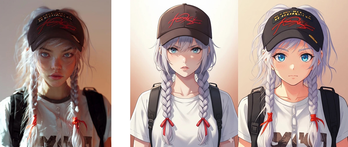 2Dのイラストのキャラクター(左)を参照して3Dフィギュアの画像をシーン込みで生成したサンプル(右)