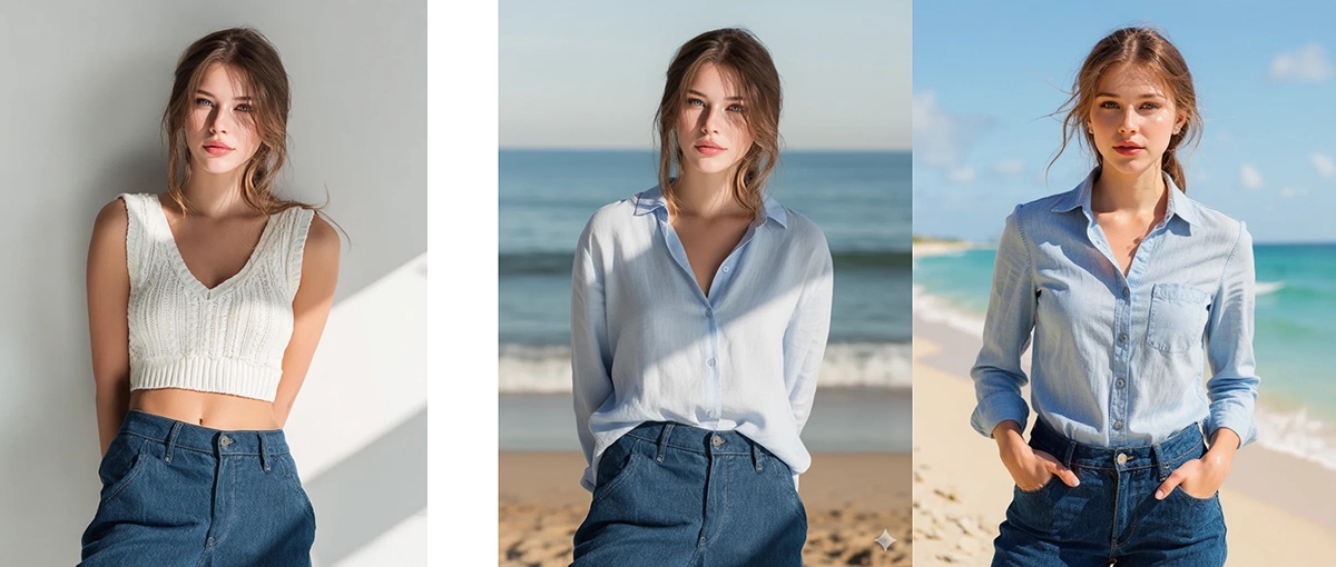 参照画像(左)を使った衣装・背景の置き換え生成のサンプル。中央が「Nano Banana」で右がFLUX Kontextこれは「Nano Banana」を含む “次世代モデル” と呼ばれるような最新の画像生成AIがかなり注力しているポイントで、元画像を大きく変えずに画像内の一部を編集するような作業にも効果的です。