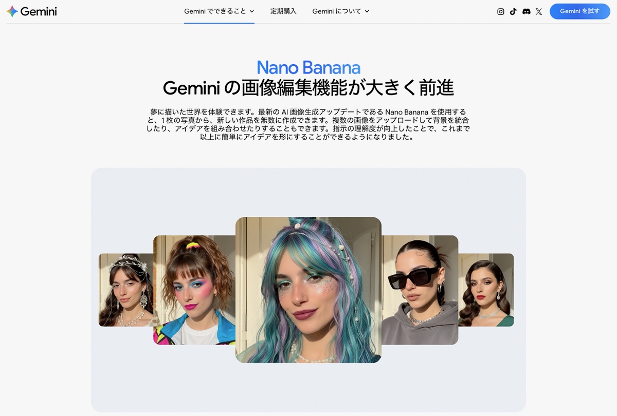 「Gemini 2.5 Flash Image(Nano Banana)」URL:https://gemini.google/jp/overview/image-generation/「Nano Banana」は動作が非常に軽快であることが魅力で、それまでの一般的な「画像生成AIは便利だけれど処理が重い」というイメージを大きく書き換えました。モバイルデバイスなどでもスムーズに動作するように最適化されており、スマホやタブレットで容易に扱いやすいことからユーザーへと急速に普及しています。開発者やクリエイターがAI機能を容易に組み込みやすいことも強みです。「Nano Banana」は日常会話のような自然な言葉で簡単に指示を出すことができ、Black Forest LabsのFLUX Kontextなどの競合モデルと比べてしばしば「初心者に優しくホビーユーザーとの親和性が高い」と評されることもあります。また、Google検索やNotebookLMにも統合され、今後はGoogleフォトにも導入が予定されており、単なる画作りのみにとどまらない重要な技術の1つです。複数枚の画像生成でも一貫性を維持できる「Nano Banana」の大きな特徴として、画像とテキストのどちらも高度に理解できるマルチモーダルモデルであることも挙げられます。デザインの分野では、画像生成AIは「とにかく文字が苦手」な印象で、生成された画像に現実にはない文字が含まれて困った経験のあるクリエイターも多いことでしょう。今後さらなる進化によって、画像内のテキスト編集がより正確かつスムーズにできるようになることも期待されます。さらに「Nano Banana」は、それまでの画像生成AIの弱点とされていた「一貫性の維持」が得意であることも強みです。たとえば1つのキャラクターを表情やポーズを変えながら何度も生成するときに、常にしっかりと同じキャラクターに見えるように整合性を保ちながら処理できます。